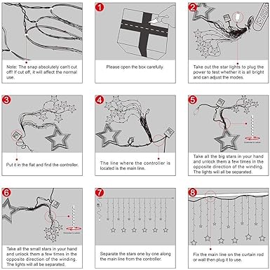 Designed with user convenience in mind, these curtain lights include 12 beautifully crafted stars in two sizes, totaling 138 LEDs. The low voltage and UL-listed power supply ensures safe and easy operation—just plug in to power on, and unplug to turn off.