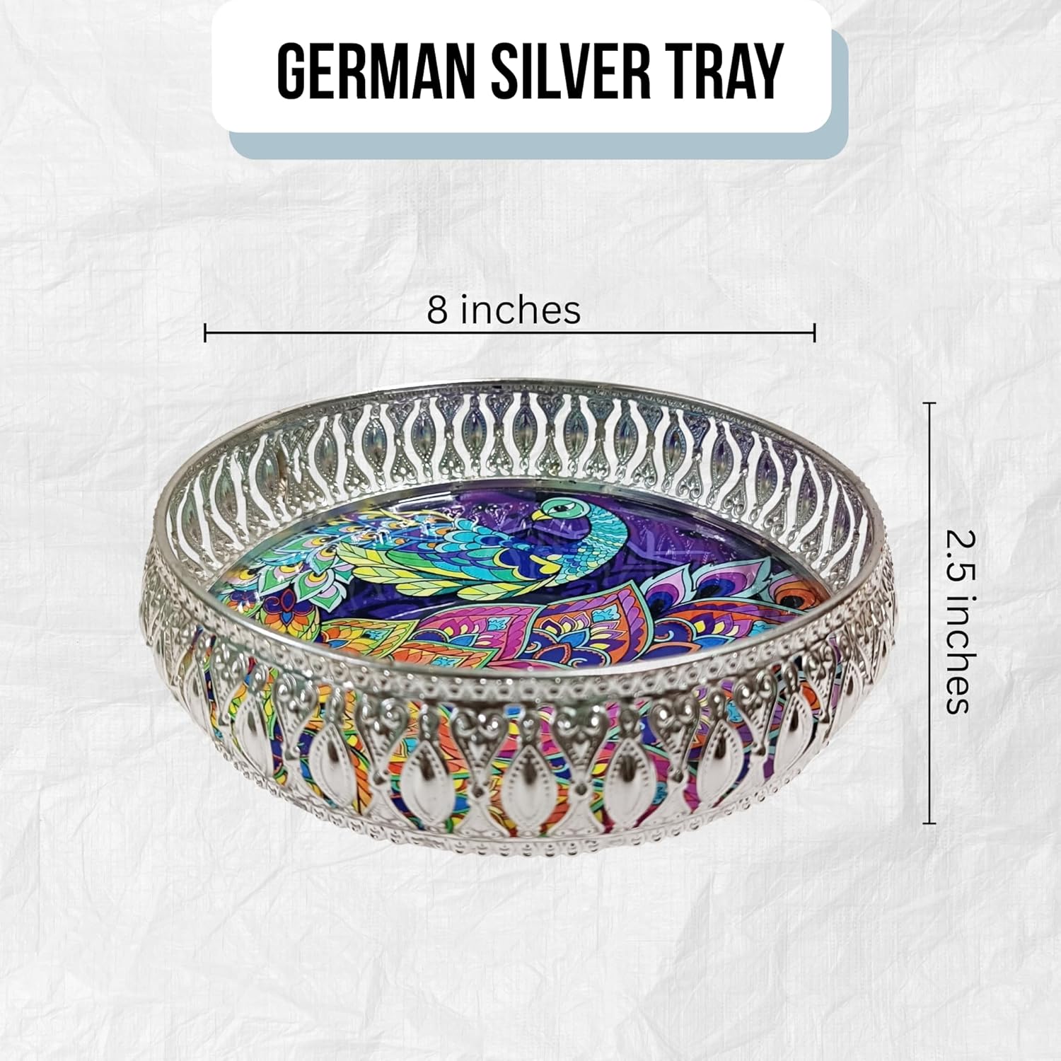 Elegant Silver German Decorative Tray 8 Inch – Handcrafted Pichwai Design with Detailed Engraving, Ideal for Dry Fruits, Sweets, Weddings, and Festive Gifting